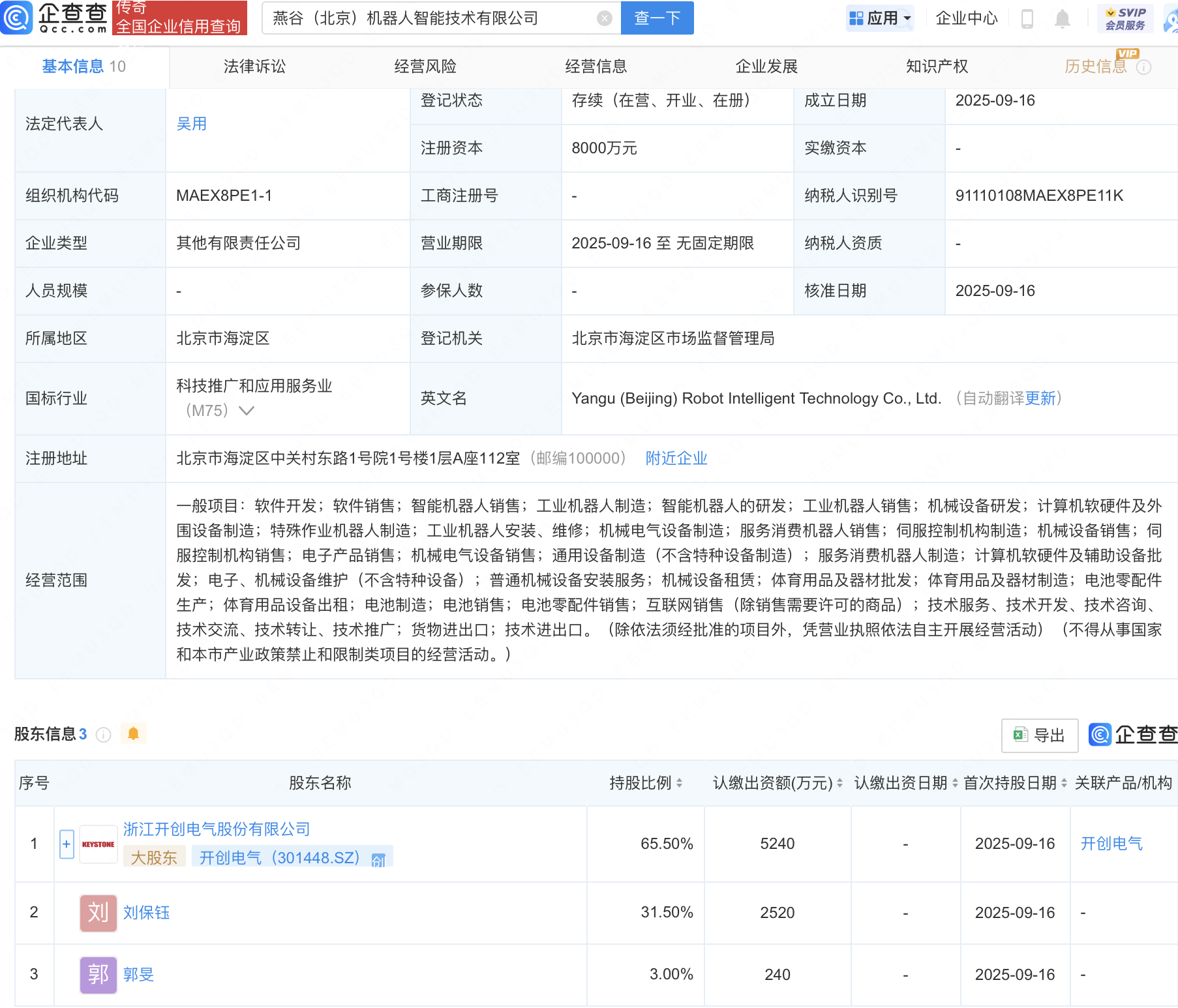 企查查APP显示,近日,燕谷(北京)机器人智能技术有限公司成立,注册资本8000万元,经营范围包含:智能机器人销售;工业机器人制造;智能机器人的研发;工业机器人销售等。企查查股权穿透显示,该公司由开创电气(301448)等共同持股。