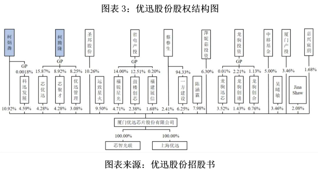 招股书显示,柯炳粦仅直接持有优迅股份10.92%的股份,并通过担任科迅发展的执行事务合伙人间接控制优迅股份4.59%的表决权;柯腾隆不直接持股,而是通过担任员工持股平台芯优迅、芯聚才、优迅管理的执行事务合伙人合计控制优迅股份11.63%的表决权,其中优迅管理的股权(3.08%)来自Ping Xu的无偿赠与。