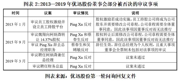 不过,在这一阶段,Ping Xu对优迅股份仍有较大的影响力。第一轮问询回复文件显示,2013—2019年,优迅股份董事会关于“员工股权激励并设立员工持股平台”“魏翔向柯炳粦转让14.37%股权”“聘任柯炳粦兼任总经理”“聘任财务总监”等议案均因Ping Xu及蔡春生的反对而“流产”。此外,2016—2018年、2020年,该公司未召开董事会,其最高权力机构运行陷入停滞。
