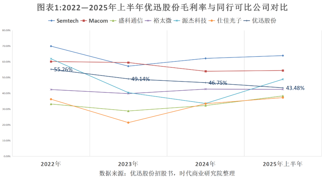 优迅股份在招股书中表示,境外同行可比公司的产品矩阵丰富,并且还是光通信电芯片行业全球领先企业,产品速率覆盖100Mbps~1.6Tbps等,拥有较高的定价权,因此毛利率更高。