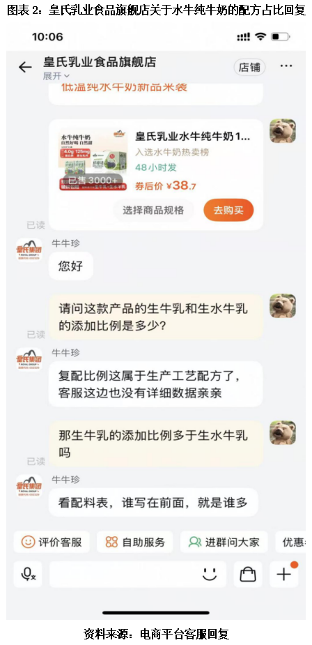 然而,时代商业研究院在咨询皇氏乳业食品旗舰店(经营资质为皇氏集团全资子公司皇氏数字科技有限公司)电商客服生水牛乳添加比例时,客服以“复配比例属于生产工艺配方”“没有详细数据”为由,无法提供水牛奶添加比例。