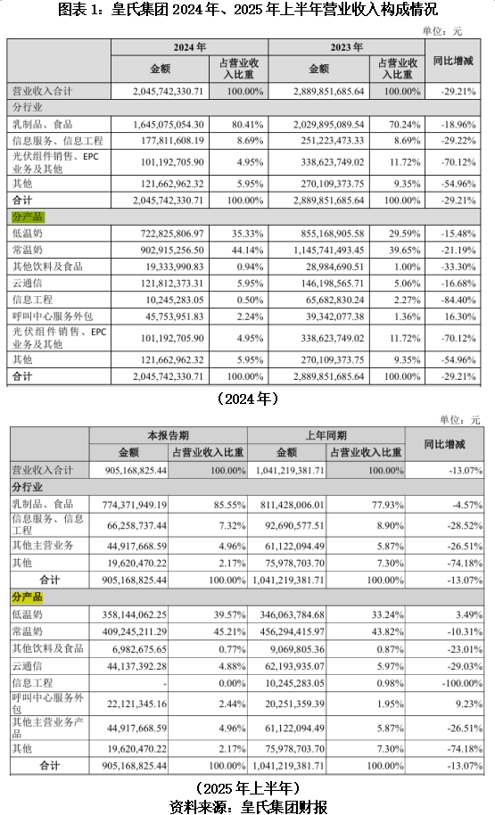 而从2025年半年报来看,皇氏集团分行业的收入同样呈现明显的下滑趋势。