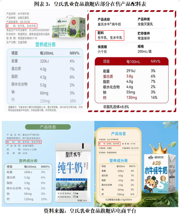 皇氏乳业食品旗舰店销售的多款“皇氏水牛纯牛奶”产品配料均标示为“生牛乳、生水牛乳”,但实际上“皇氏水牛”仅是注册商标,产品本质是添加了生水牛乳的“纯牛奶”。