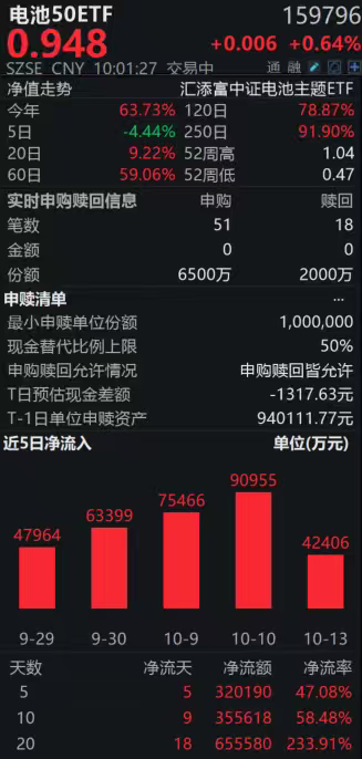 电池50ETF(159796)备受资金青睐,近5日资金净流入超32亿,近20日资金净流入超65亿;截至10月10日,该基金规模攀升至98.34亿元,高居同类第一;截至发稿,该基金盘中再获资金净申购4500万份。