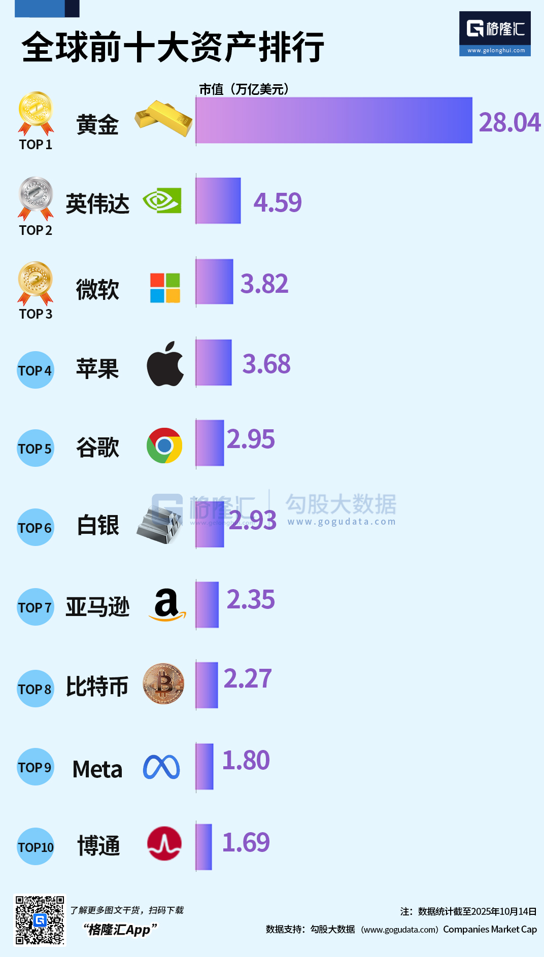 从具体数据上看,即使将英伟达(4.585万亿美元)、微软(3.821万亿美元)、苹果(3.675万亿美元)、谷歌(2.952万亿美元)、白银(2.911万亿美元)、亚马逊(2.347万亿美元)、比特币(2.263万亿颅美元)、Meta(1.797万亿美元)、博通(1.684万亿美元)、沙特阿美(1.616万亿美元)的市值加起来,也低于黄金总市值(28.011万亿美元)。