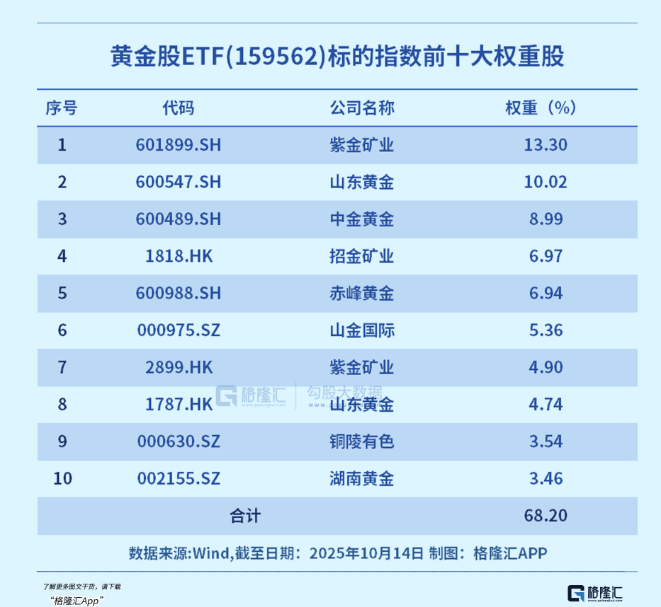 又如黄金股ETF(159562),则是股票型ETF,投资于在港A股上市的黄金相关公司,权重股聚焦金矿股,如紫金矿业、山东黄金、中金黄金等,也包含少部分珠宝零售公司,如老铺黄金、周大福等。