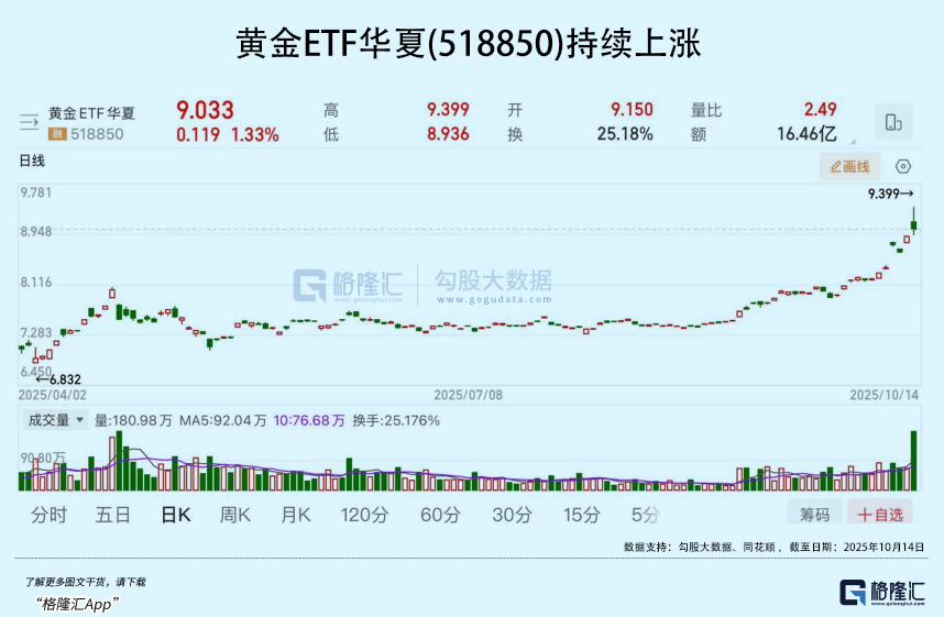 黄金股ETF(159562)年内涨超94%,黄金ETF华夏(518850)年内涨超51%。