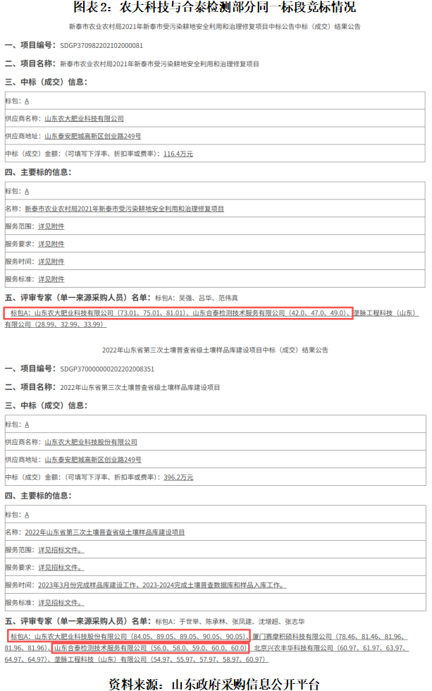 具体来看,农大科技与合泰检测分别在包括“新泰市农业农村局2021年新泰市受污染耕地安全利用和治理修复项目”“阳谷县安全利用耕地治理、拟开垦耕地土壤污染状况调查、耕地土壤环境质量类别划分调整项目”“2022年山东省第三次土壤普查省级土壤样品库建设项目”“泰安高新区第三次全国土壤普查项目”四个项目的同一标段同场竞标。
