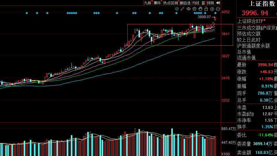 大盘今天是继续走新高,盘中最高3999,距离4000点就差了1个点