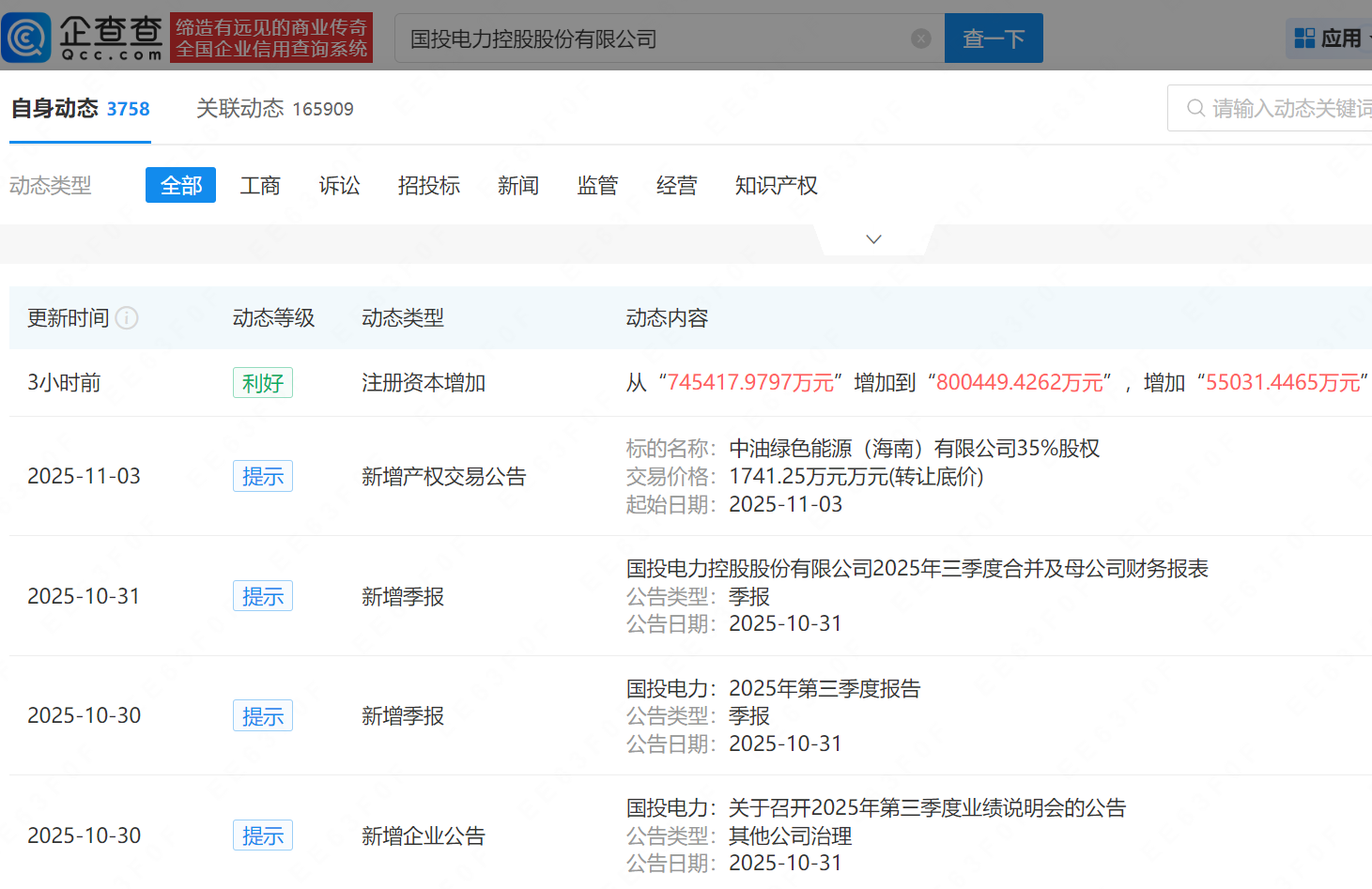 企查查APP显示,近日,国投电力(600886)发生工商变更,注册资本由约74.54亿元增至约80.04亿元,增幅约7%。企查查信息显示,该公司成立于1996年6月,法定代表人为郭绪元,经营范围包含投资建设、经营管理以电力生产为主的能源项目等,由国家开发投资集团有限公司、长江电力(600900)等共同持股。