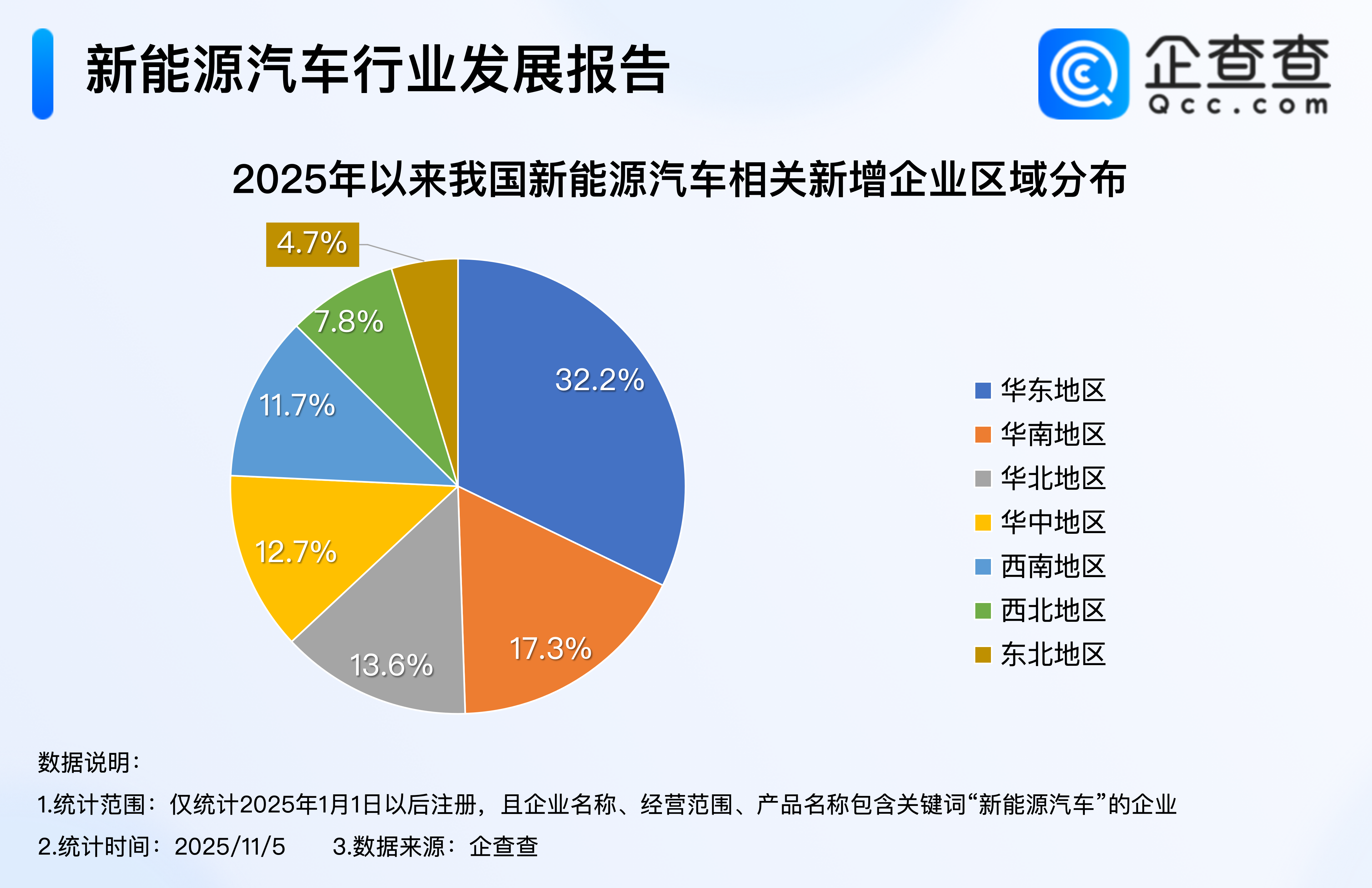 企查查数据显示,2025年以来新注册的27.1万家新能源汽车相关企业中,位于华东地区的企业最多,占比32.2%,其次是华南地区,占比17.3%;东北地区新能源汽车相关企业相对较少,占比4.7%。