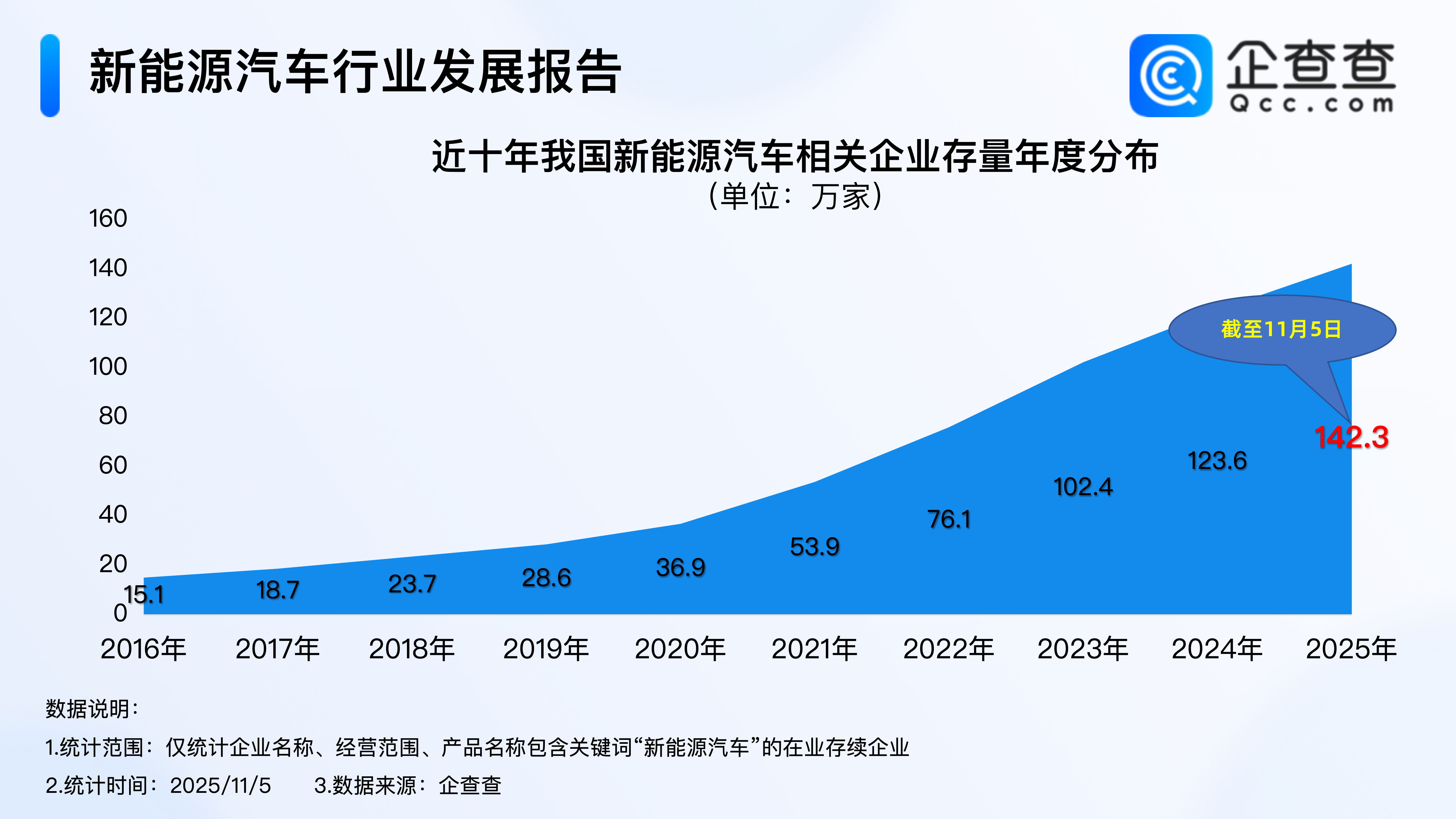 企查查数据显示,近十年,我国新能源汽车行业规模日益壮大,并分别于2021年、2023年首次突破50万家、100万家;截至11月5日,我国现存142.3万家新能源汽车相关企业。