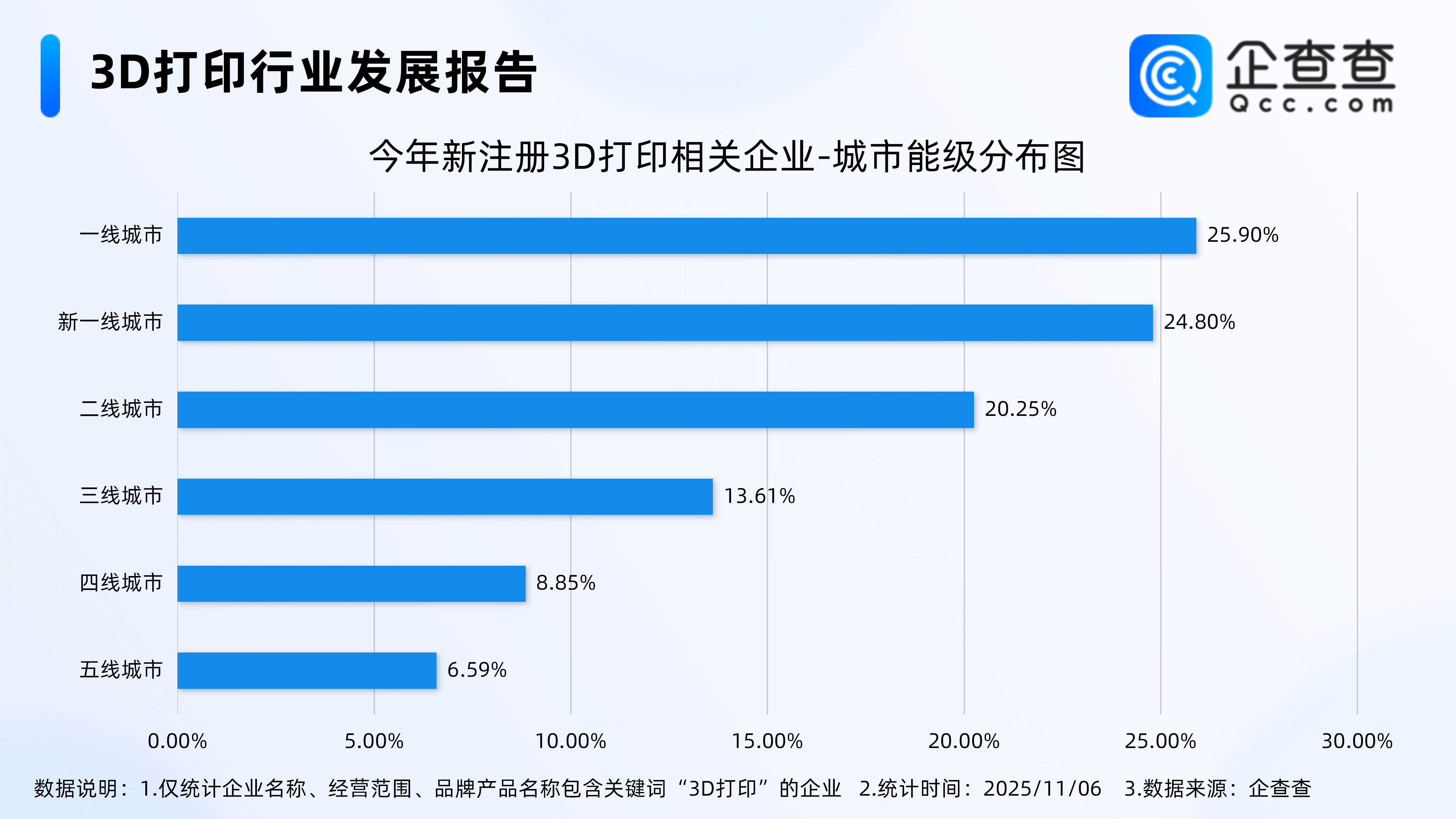 企查查数据显示,截至11月6日,国内现存3D打印相关企业18.28万家。从经营时间来看,3D打印相关企业多成立于近三年,其中,成立年限在1-3年的相关企业最多,占比34.38%。注册量方面,近十年3D打印相关企业注册量呈整体增长态势,2024年全年注册相关企业3.99万家,与前一年持平。截至目前,今年已注册3D打印相关企业3.91万家,其中前10月注册3.89万家,同比增长20.39%。从城市能级分布来看,今年新注册的3D打印相关企业多分布在一线城市,占比25.90%。