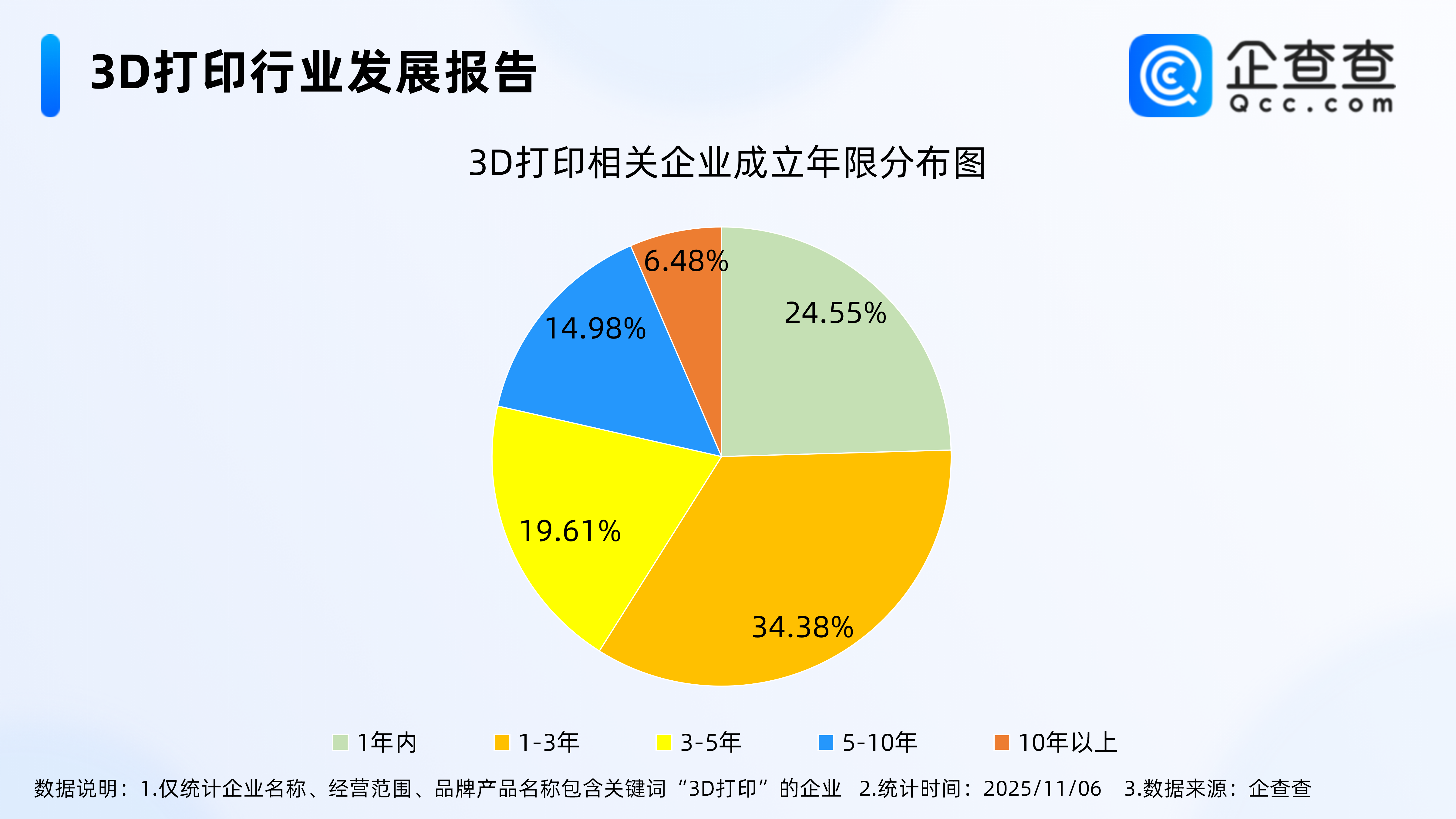 企查查数据显示,从经营时间来看,3D打印相关现存企业多成立于近三年,成立年限在1-3年的相关企业最多,占比34.38%。其次,成立年限在1年内的相关企业占比24.55%。