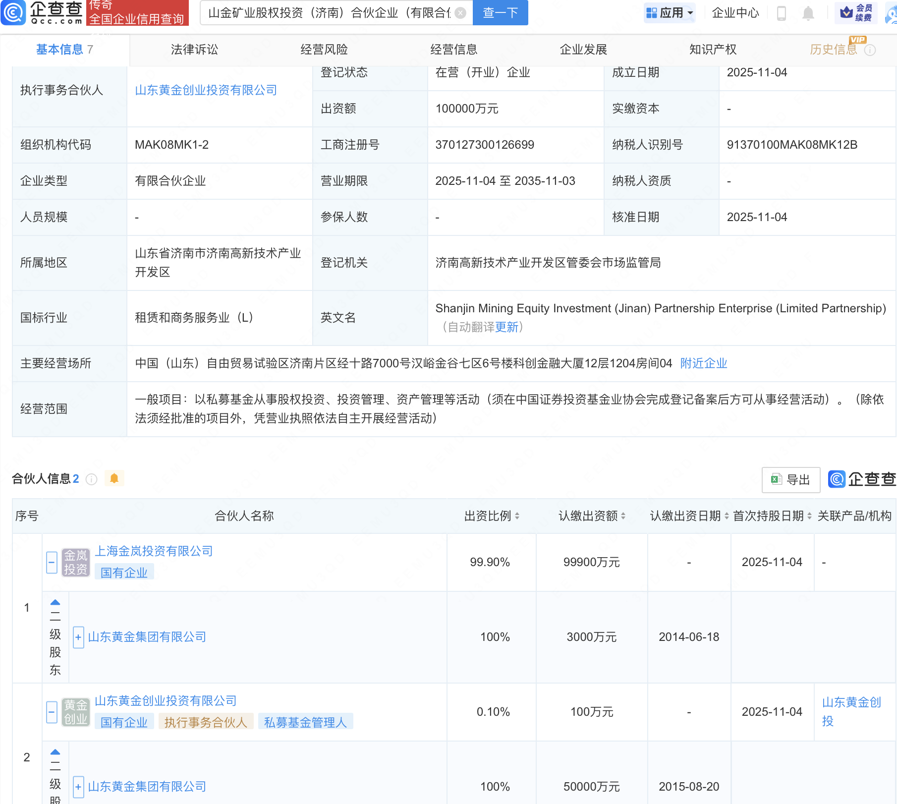 企查查APP显示,近日,山金矿业股权投资(济南)合伙企业(有限合伙)成立,出资额10亿元,经营范围包含:以私募基金从事股权投资、投资管理、资产管理等活动。企查查股权穿透显示,该企业由山东黄金集团有限公司间接全资持股。