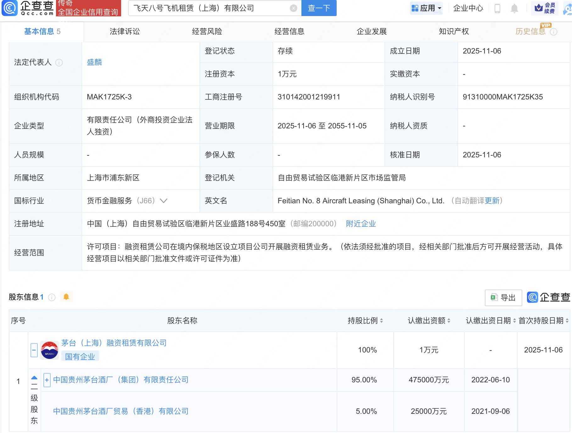 企查查APP显示,近日,飞天八号飞机租赁(上海)有限公司成立,法定代表人为盛麟,经营范围包含:融资租赁公司在境内保税地区设立项目公司开展融资租赁业务。企查查股权穿透显示,该公司由中国贵州茅台酒厂(集团)有限责任公司旗下茅台(上海)融资租赁有限公司全资持股。