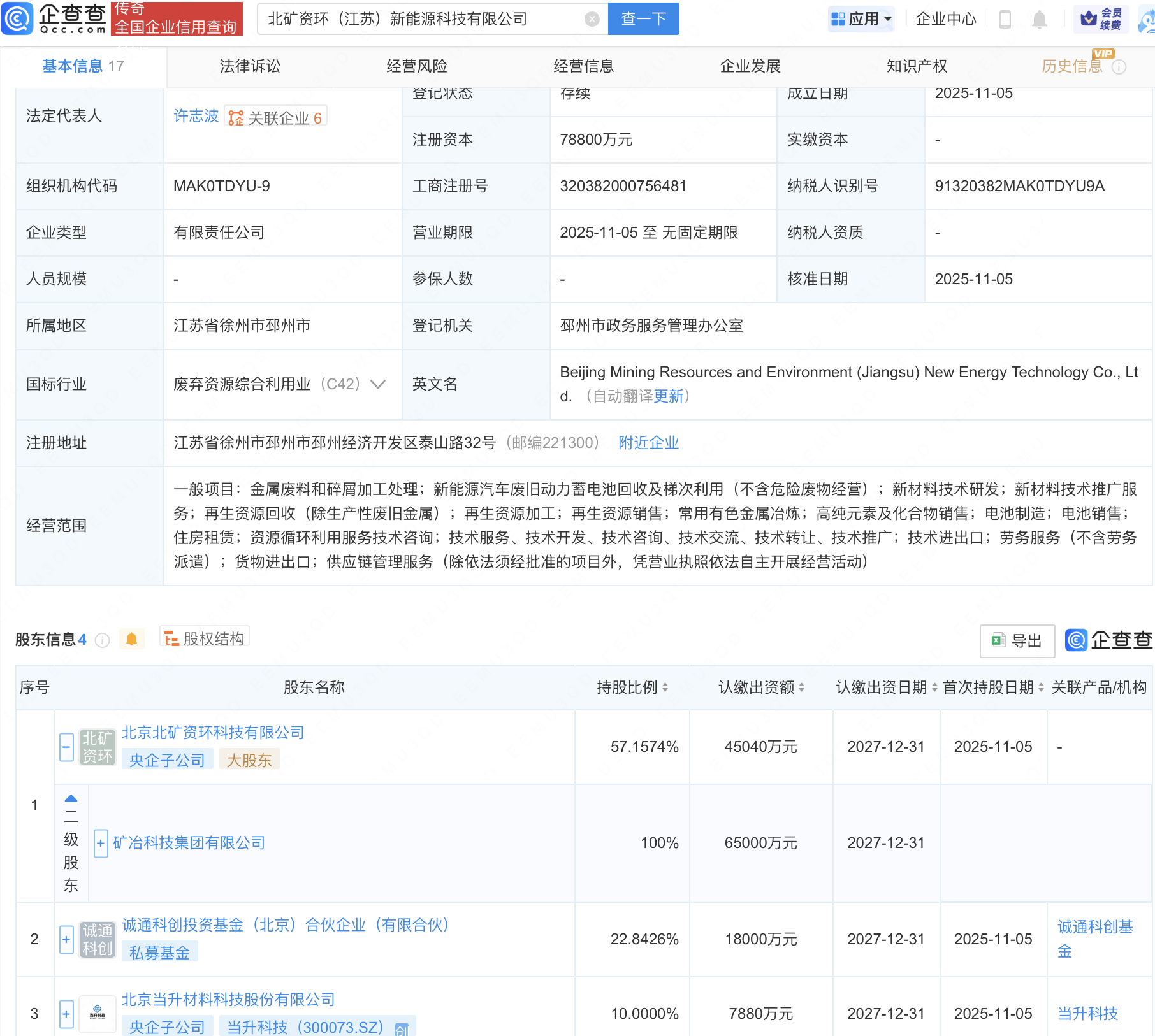 企查查APP显示,近日,北矿资环(江苏)新能源科技有限公司成立,注册资本7.88亿元,经营范围包含:常用有色金属冶炼;高纯元素及化合物销售;电池制造;电池销售等。企查查股权穿透显示,该公司由矿冶科技集团有限公司全资子公司北京北矿资环科技有限公司、诚通科创投资基金(北京)合伙企业(有限合伙)、当升科技(300073)等共同持股。