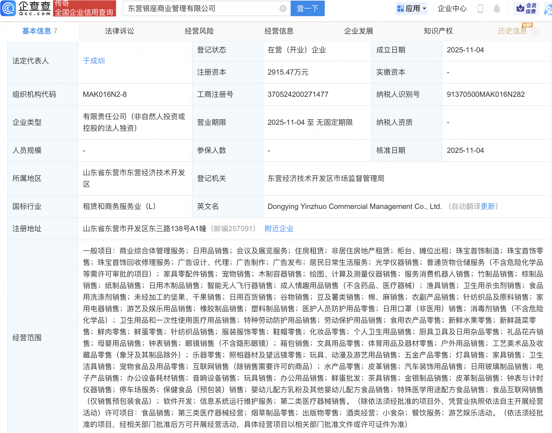 企查查APP显示,近日,东营银座商业管理有限公司成立,法定代表人为于成圳,经营范围包含:智能无人飞行器销售;食品销售;第三类医疗器械经营;烟草制品零售;出版物零售等。企查查股权穿透显示,该公司由银座股份(600858)全资持股。