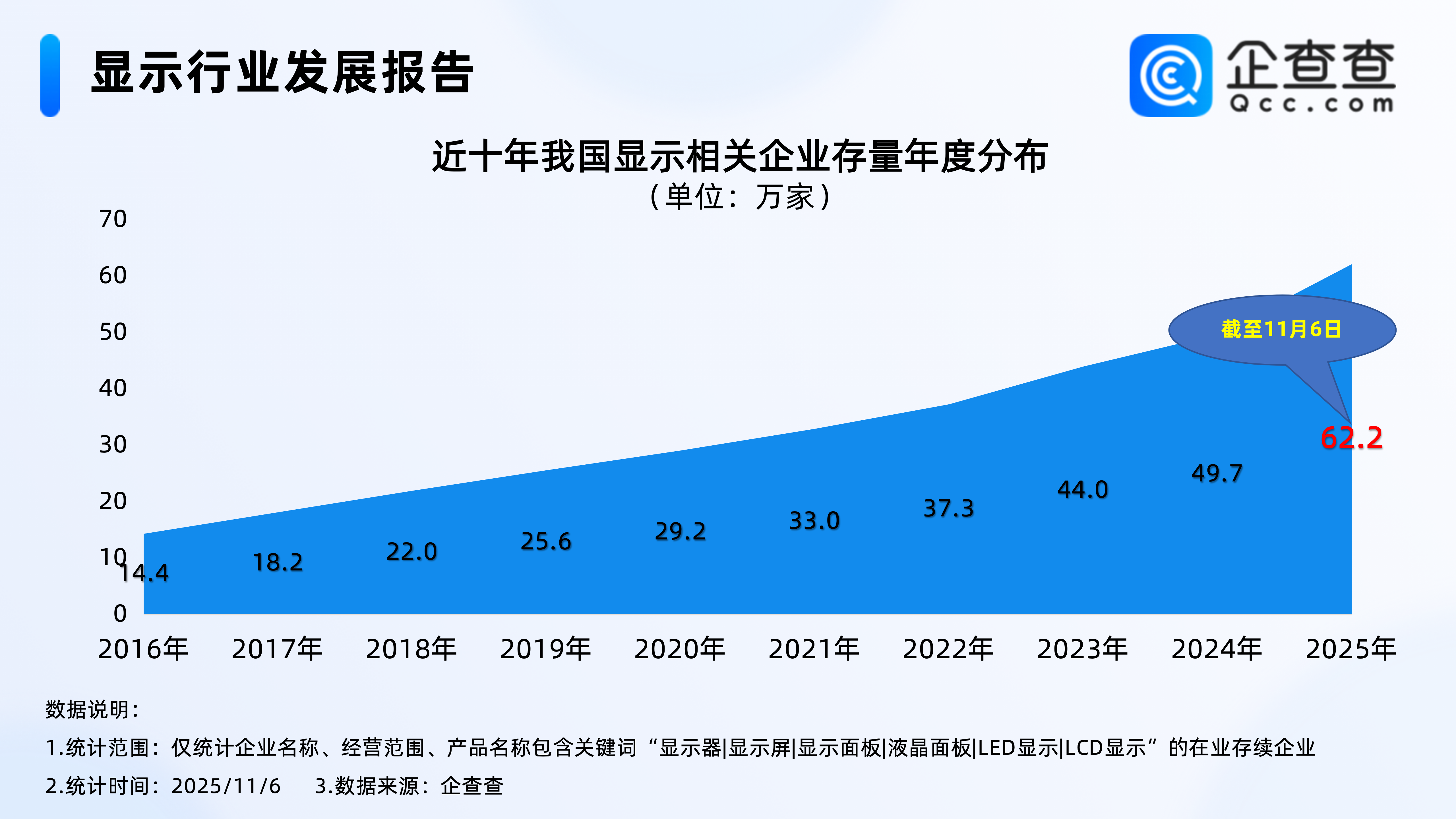 企查查数据显示,近十年,伴随显示相关企业注册量规模的提升,我国显示相关企业存量稳定增加,截至11月6日,我国现存62.2万家显示相关企业。