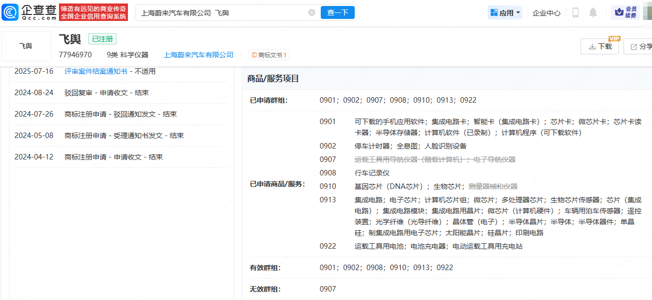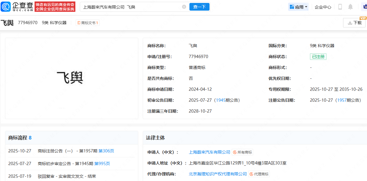 企查查APP显示,近日,上海蔚来汽车有限公司申请的“飞舆”商标注册成功,国际分类为9类 科学仪器,已申请商品/服务包括:集成电路卡;智能卡(集成电路卡);芯片卡;微芯片卡;集成电路;电子芯片等。