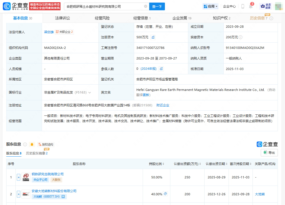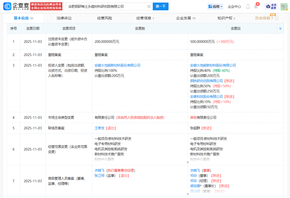 企查查APP显示,近日,合肥钢研稀土永磁材料研究院有限公司发生工商变更,新增安泰科技(000969)、钢铁研究总院有限公司为股东,注册资本由200万元人民币增至500万元人民币,同时法定代表人及高管均发生变更。企查查信息显示,合肥钢研稀土永磁材料研究院公司成立于2023年9月,经营范围涉及新材料技术研发、电子专用材料研发、新材料技术推广服务等,原股东大地熊(688077)当前持股比例为40%。