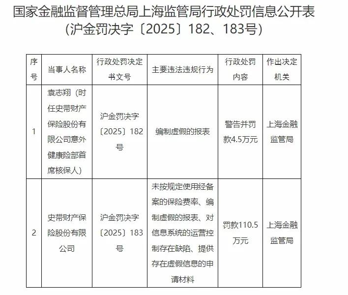 11月6日,国家金融监督管理总局上海监管局发布的行政处罚信息显示,史带财险因“未按规定使用经备案的保险费率、编制虚假的报表、对信息系统的运营控制存在缺陷、提供存在虚假信息的申请材料”的违规行为,被罚款110.5万元。
