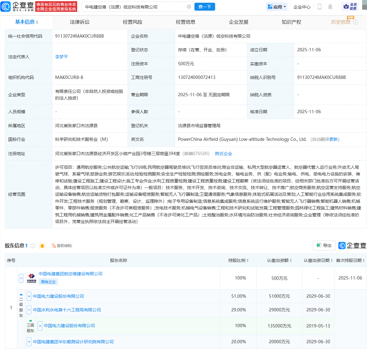 企查查APP显示,近日,中电建空港(沽源)低空科技有限公司成立,法定代表人为李梦平,经营范围包含:通用航空服务;公共航空运输;飞行训练;民用航空器驾驶员培训;飞行签派员培训等。企查查股权穿透显示,该公司由中国电建(601669)旗下中国电建集团航空港建设有限公司全资持股。