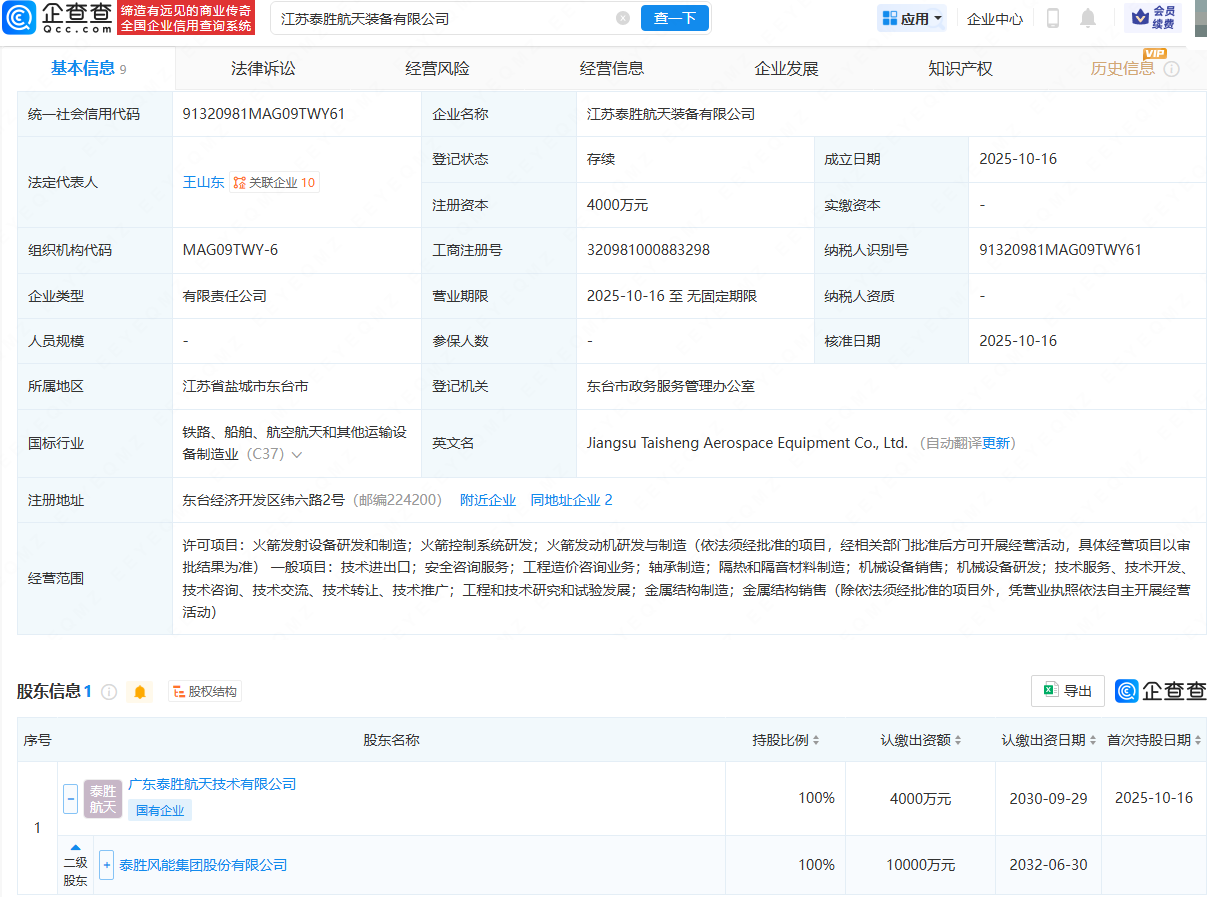 企查查APP显示,近日,江苏泰胜航天装备有限公司成立,法定代表人为王山东,注册资本为4000万元,经营范围包含:火箭发射设备研发和制造;火箭控制系统研发;火箭发动机研发与制造;轴承制造等。企查查股权穿透显示,该公司由泰胜风能(300129)间接全资持股。
