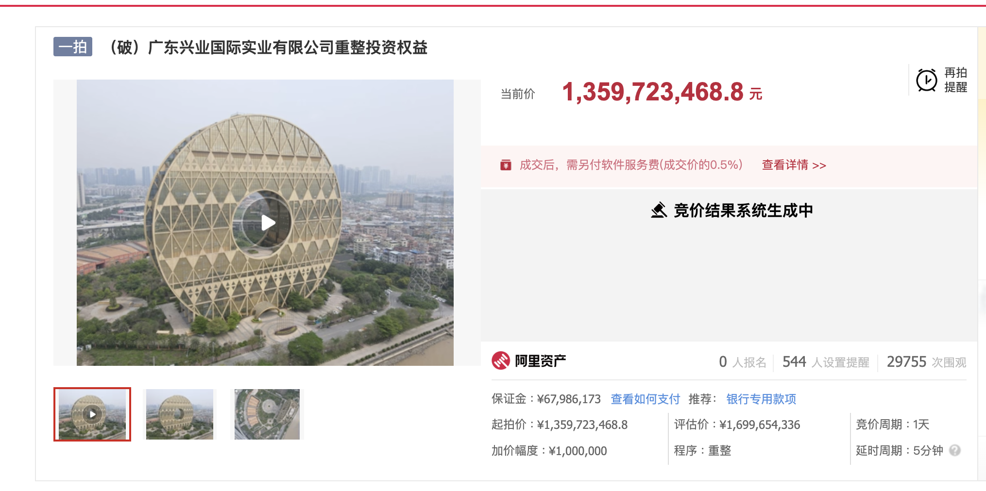 阿里拍卖平台披露的信息显示,11月14日10点,广东兴业国际实业有限公司重整投资权益因无人竞拍而流拍,拍品所有人为广东兴业国际实业有限公司,拍卖原因系破产重整。