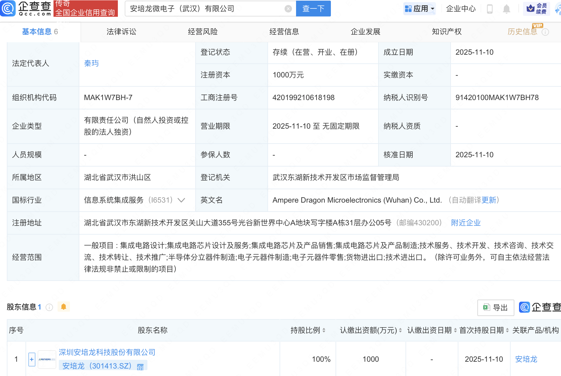 企查查APP显示,近日,安培龙微电子(武汉)有限公司成立,注册资本1000万元,经营范围包含:集成电路设计;集成电路芯片设计及服务;集成电路芯片及产品销售;半导体分立器件制造等。企查查股权穿透显示,该公司由安培龙(301413)全资持股。