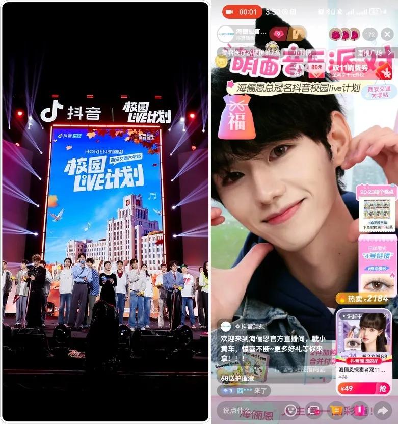 品牌将 “萌系” 转化为情感载体,在大促期间主推“萌生宠爱”小狗系列产品,通过精准捕捉 Z 世代共鸣,成功打造差异化心智。更为巧妙的是,海俪恩总冠名平台SS级线下活动“校园LIVE计划”,策划达人“一日店长”、周边礼品赠送、IP人偶等玩法,在线下吸引海量年轻人关注的同时,这些活动也会积极引导到场用户前往线上平台关注品牌,让品牌温度扎根用户心中的同时,也为品牌激活线上流量。