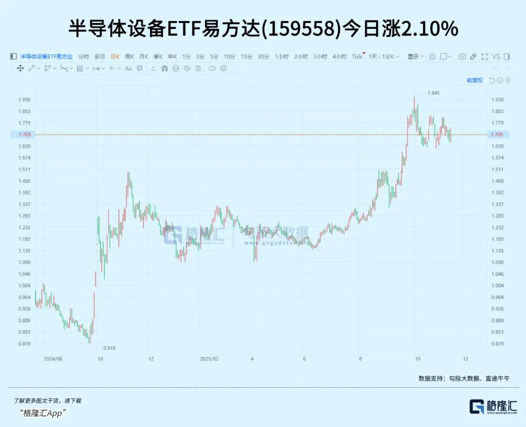 作为AI产业链的上游领域,近月一直调整的半导体则迎来回暖,龙迅股份20cm涨停,晶晨股份、东芯股份涨超10%,中微公司、北方华创、华虹公司也纷纷大幅反弹,带动半导体设备ETF易方达(159558)涨2.1%,科创板50ETF(588080)上涨0.36%。
