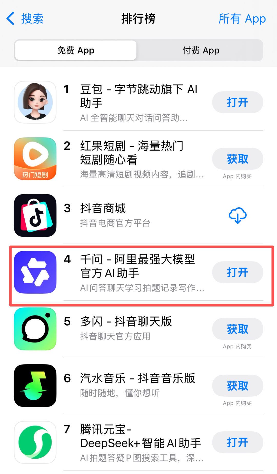 昨日阿里巴巴正式宣布“千问“项目,千问APP公测版上线。以“免费开放,人人可用”的姿态全力进军AI to C市场,围绕个人AI助手的市场争夺战已悄然升级。截至目前,千问APP在公测上线次日便迅速冲入苹果App Store免费应用总榜第四位,排名超越DeepSeek。