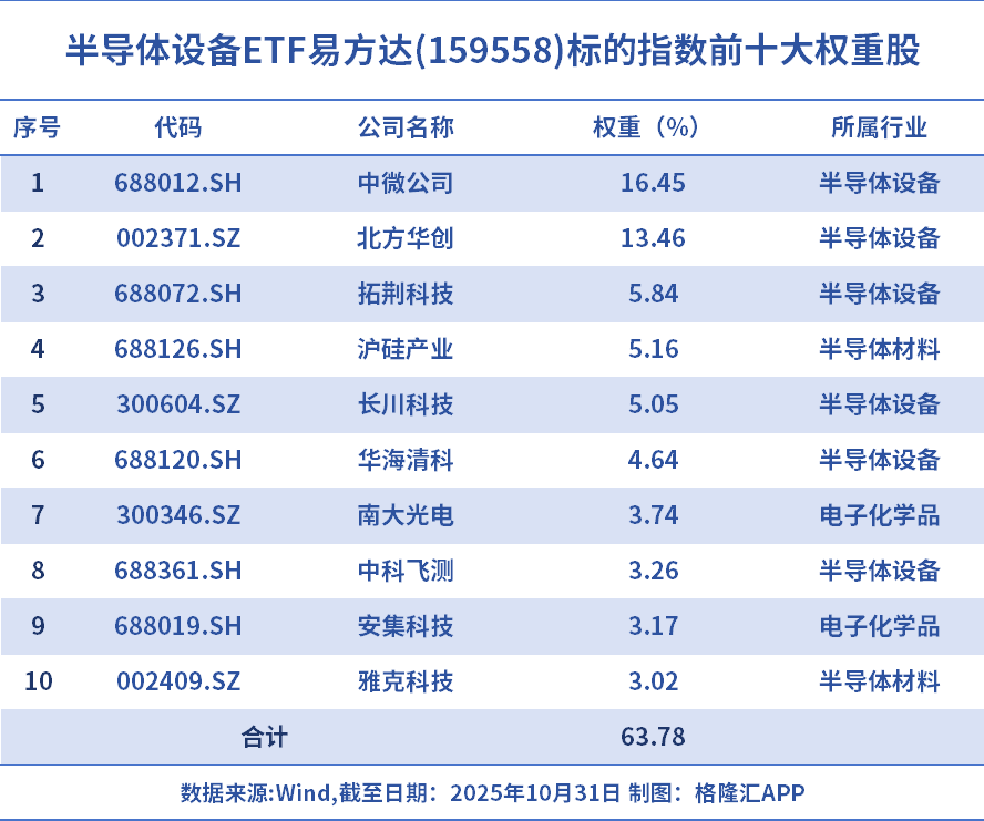 半导体设备ETF易方达(159558)高度契合国产替代主线,跟踪指数紧扣半导体两大“卡脖子”主线——半导体设备(60.9%)+半导体材料(22.5%),被市场视作产业链“卖铲子”的角色,成份股覆盖光刻机、蚀刻机、薄膜沉积设备及硅片、光刻胶等关键环节龙头企业,中微公司+北方华创权重近30%。