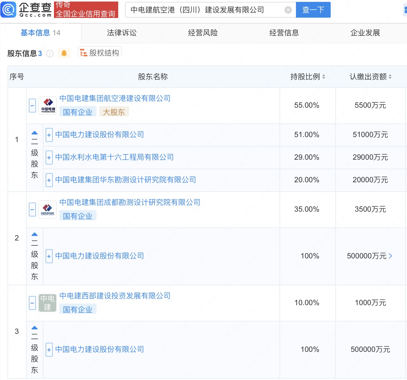 企查查APP显示,近日,中电建航空港(四川)建设发展有限公司成立,法定代表人为郭智磊,注册资本1亿人民币,经营范围包括通用航空服务、公共航空运输、人工智能行业应用系统集成服务、智能无人飞行器制造等。企查查股权穿透显示,该公司由中国电建(601669)旗下中国电建集团成都勘测设计研究院有限公司等共同持股。
