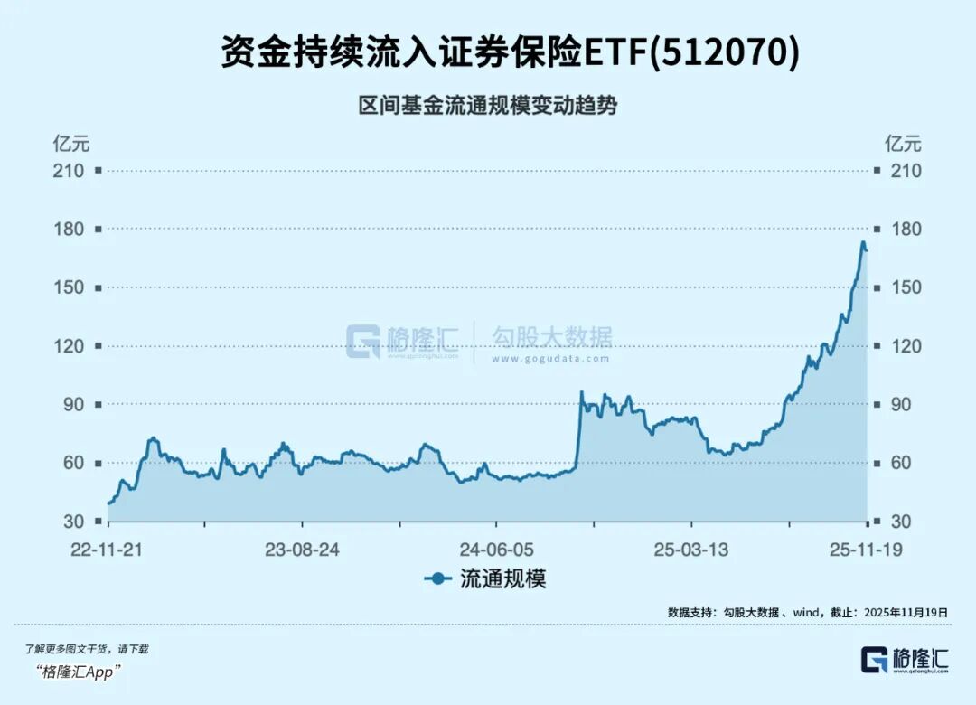 如跟踪沪深300非银行金融指数的证券保险ETF(512070),自11月以来“吸金”19.86亿元,年内资金净流入80.92亿元,最新规模169.13亿元。