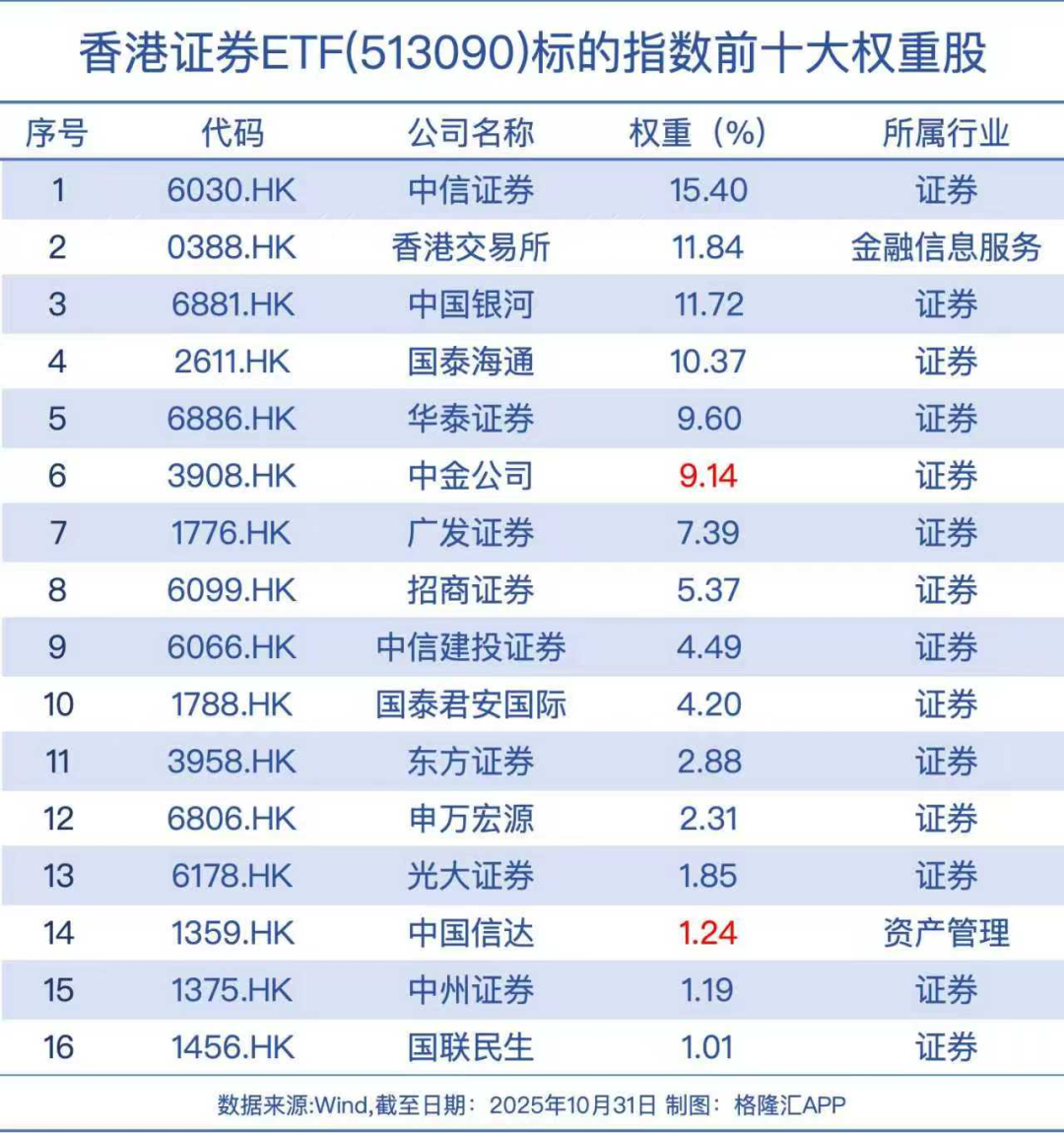 作为全市场独家品种——香港证券ETF(513090),跟踪中证香港证券投资主题指数,成份股仅16只,包括中信证券、香港交易所、国泰海通、中国银河、华泰证券、中金公司、国泰君安国际等龙头公司。