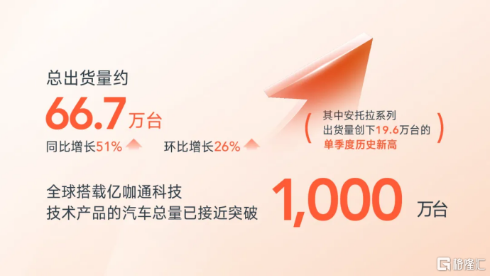 研报摘录了ECARX在第三季度实现全面盈利背景下的多项优势业绩,包括实现EBITDA 利润 830 万美元,净利润90万美元,实现了大幅度上涨,早于市场预期实现全面盈利。期内公司收入同比增长11%,至2.199亿美元,主要得益于Antora?系列计算平台(基于芯擎科技龍鹰一号)单季度实现 19.6 万套出货量,创下历史新高,同时Pikes?计算平台(基于高通SA8295P)在多款热销车型中成功实现出货。多方因素共同带动总出货量同比大增51%。