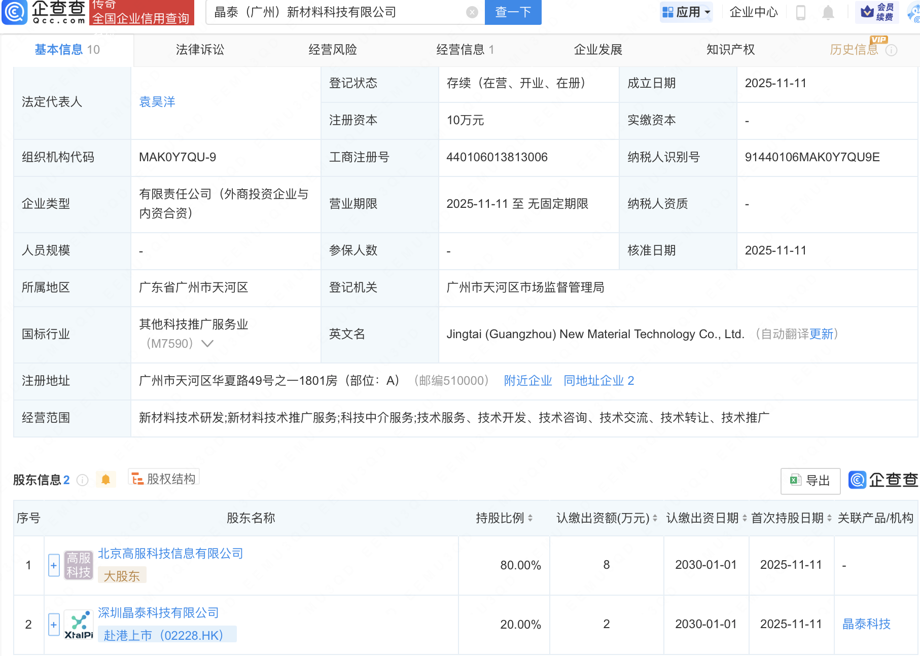 企查查APP显示,近日,晶泰(广州)新材料科技有限公司成立,经营范围包含:新材料技术研发;新材料技术推广服务;科技中介服务等。企查查股权穿透显示,该公司由晶泰控股关联公司深圳晶泰科技有限公司等共同持股。