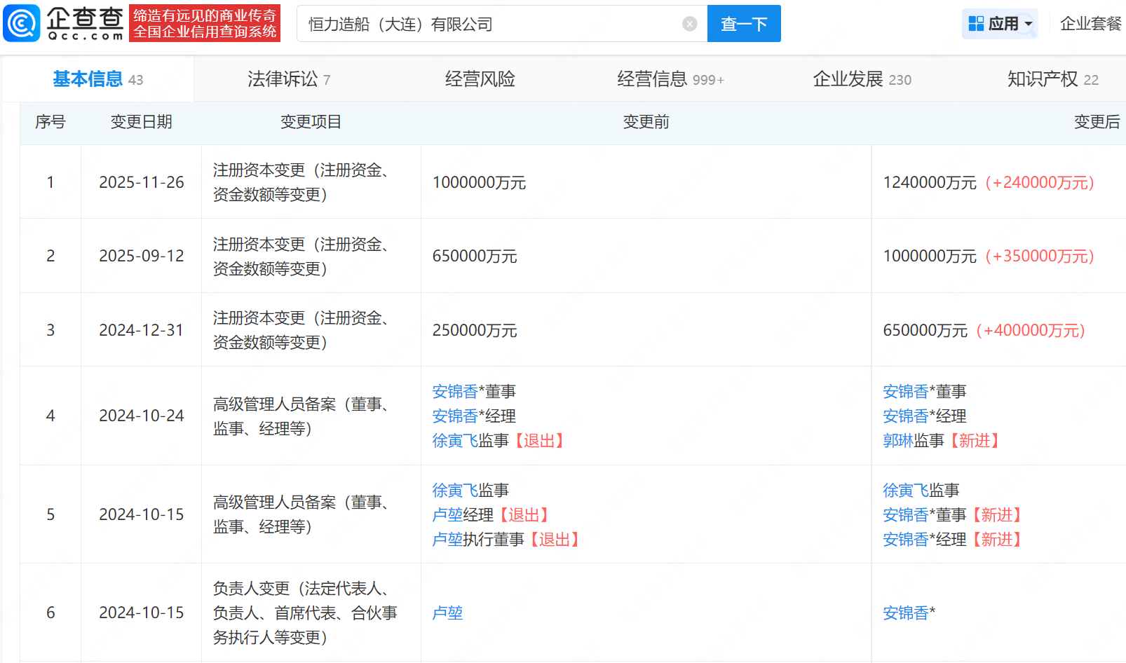 企查查APP显示,近日,恒力造船(大连)有限公司发生工商变更,注册资本由100亿元增至124亿元,增幅24%。该公司成立于2022年7月,法定代表人为安锦香,经营范围包含非金属船舶制造、船舶制造、船舶修理等,企查查股权穿透显示,恒力造船(大连)有限公司由恒力重工集团有限公司全资持股,后者为*ST松发(603268)全资子公司。