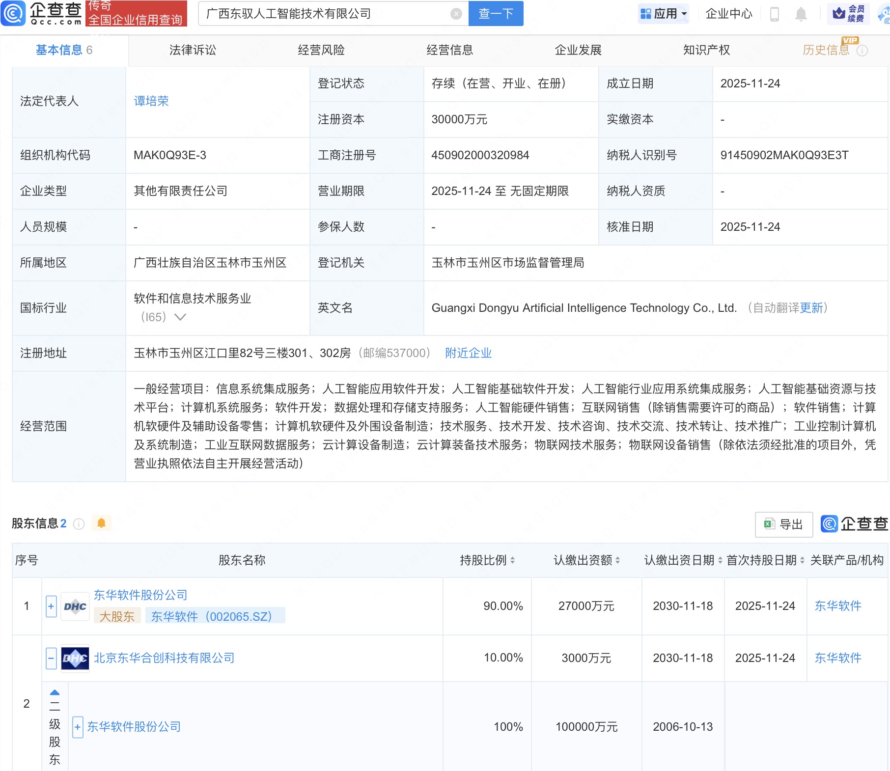 企查查APP显示,近日,广西东驭人工智能技术有限公司成立,法定代表人为谭培荣,注册资本3亿人民币,经营范围含人工智能应用软件开发、人工智能基础软件开发、人工智能行业应用系统集成服务等。企查查股权穿透显示,该公司由东华软件(002065)间接全资持股。