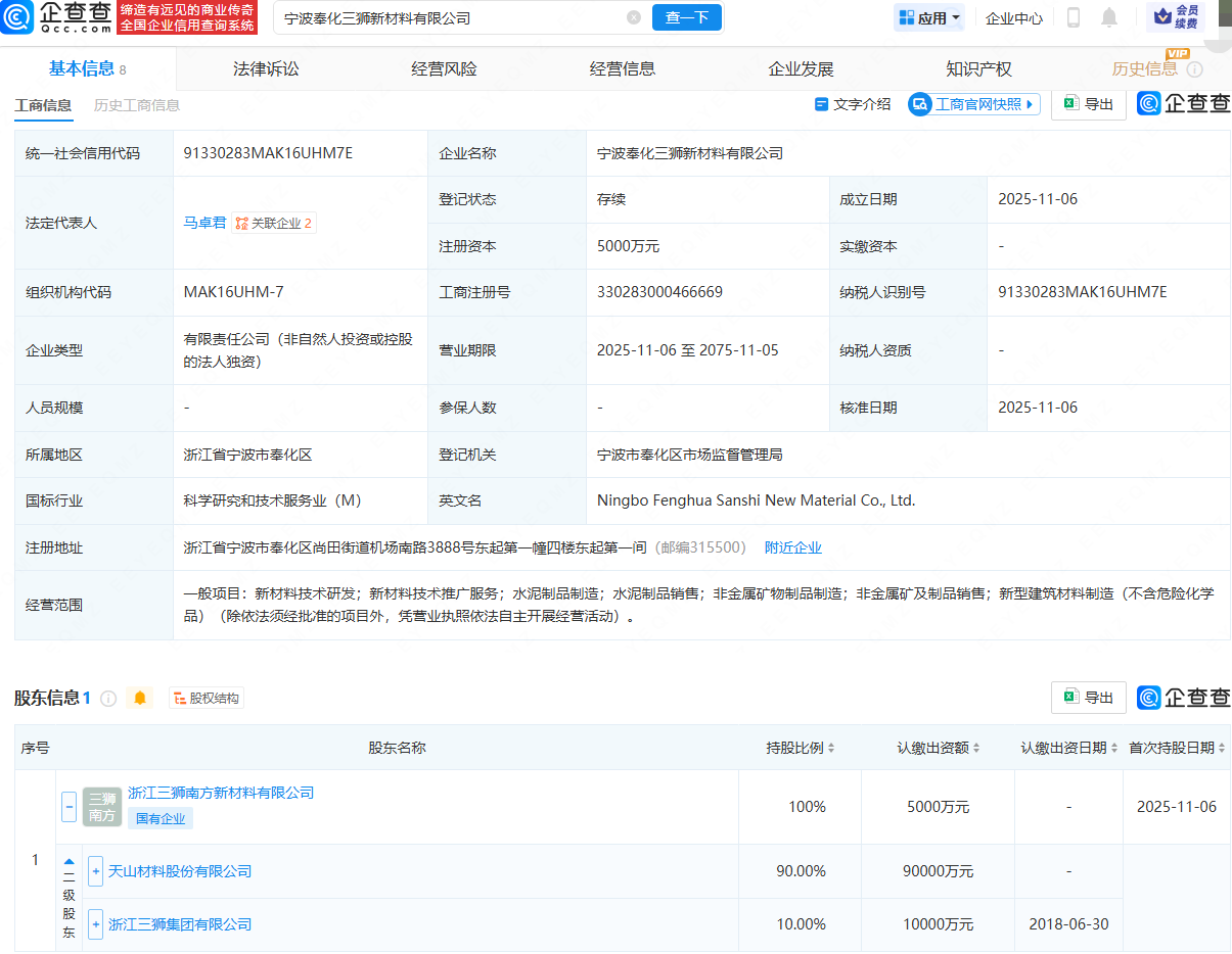 企查查APP显示,近日,宁波奉化三狮新材料有限公司成立,法定代表人为马卓君,注册资本为5000万元,经营范围包含:新材料技术研发;新材料技术推广服务;水泥制品制造;水泥制品销售;非金属矿物制品制造等。企查查股权穿透显示,该公司由天山股份(000877)旗下浙江三狮南方新材料有限公司全资持股。