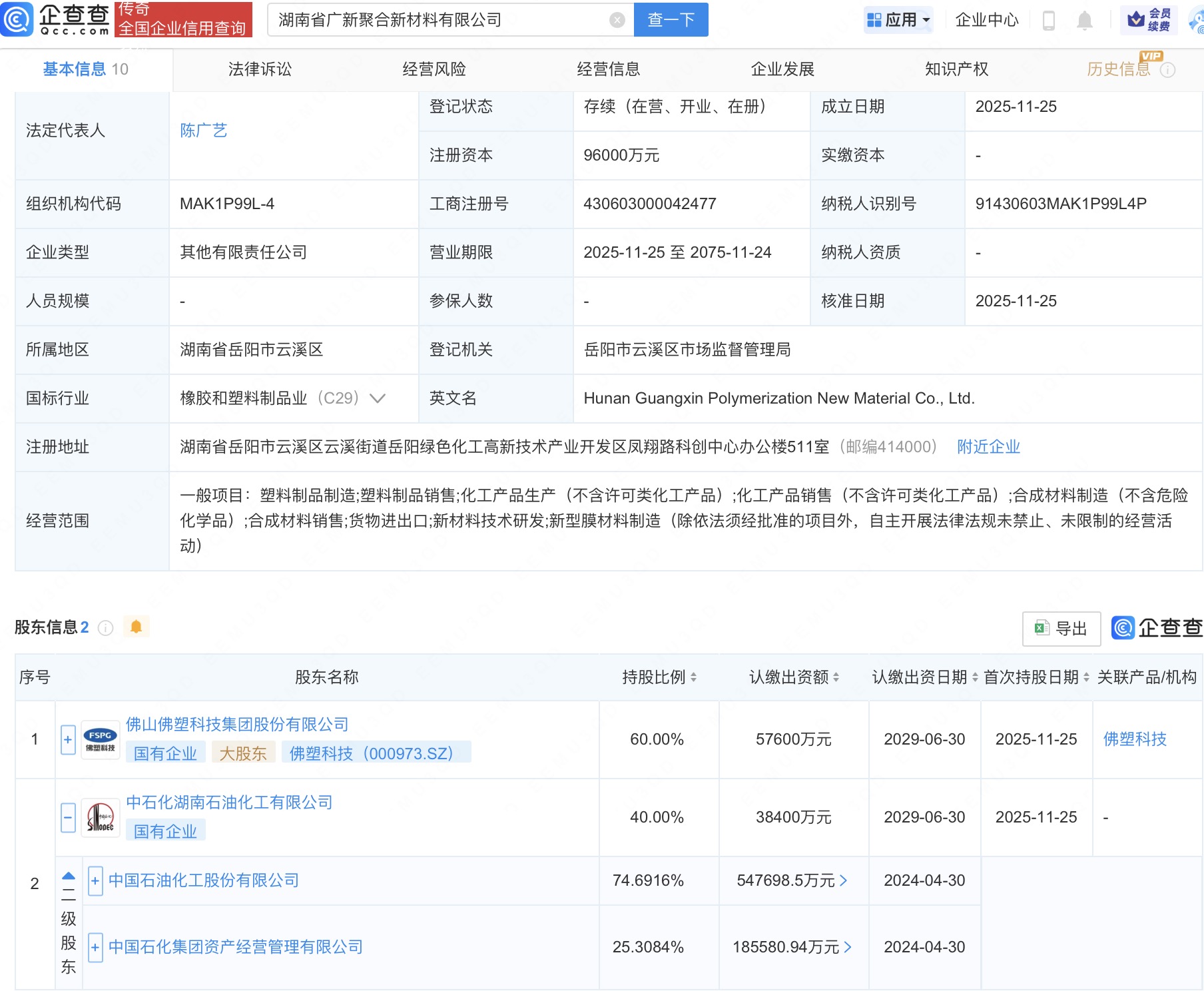 企查查APP显示,近日,湖南省广新聚合新材料有限公司成立,法定代表人为陈广艺,注册资本9.6亿人民币,经营范围包括塑料制品制造、塑料制品销售、化工产品生产、化工产品销售等。企查查股权穿透显示,该公司由佛塑科技(000973)、中国石化(600028)旗下中石化湖南石油化工有限公司共同持股。
