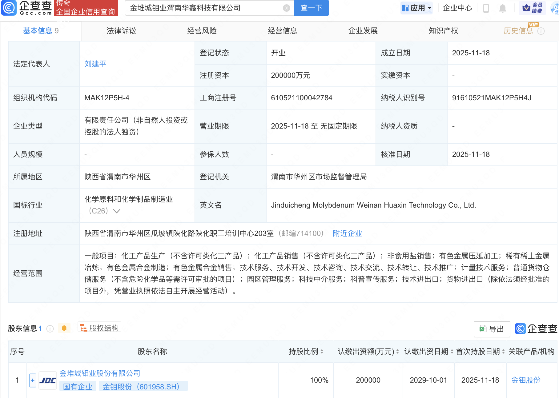 企查查APP显示,近日,金堆城钼业渭南华鑫科技有限公司成立,注册资本20亿元,经营范围包含:非食用盐销售;有色金属压延加工;稀有稀土金属冶炼;有色金属合金制造;有色金属合金销售等。企查查股权穿透显示,该公司由金钼股份(601958)全资持股。
