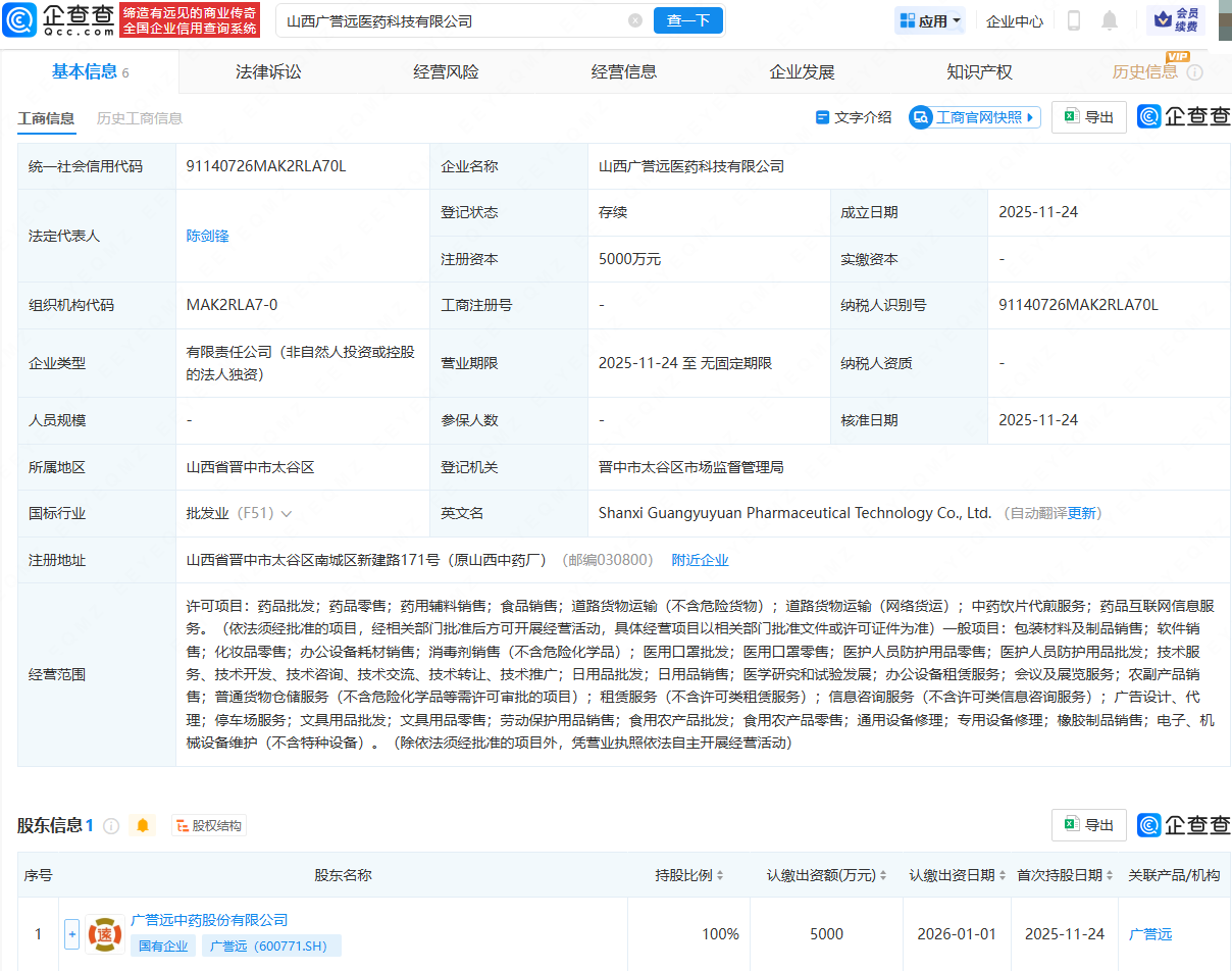 企查查APP显示,近日,山西广誉远医药科技有限公司成立,法定代表人为陈剑锋,注册资本为5000万元,经营范围包含:药品批发;药品零售;药用辅料销售;食品销售;中药饮片代煎服务;药品互联网信息服务等。企查查股权穿透显示,该公司由广誉远(600771)全资持股。