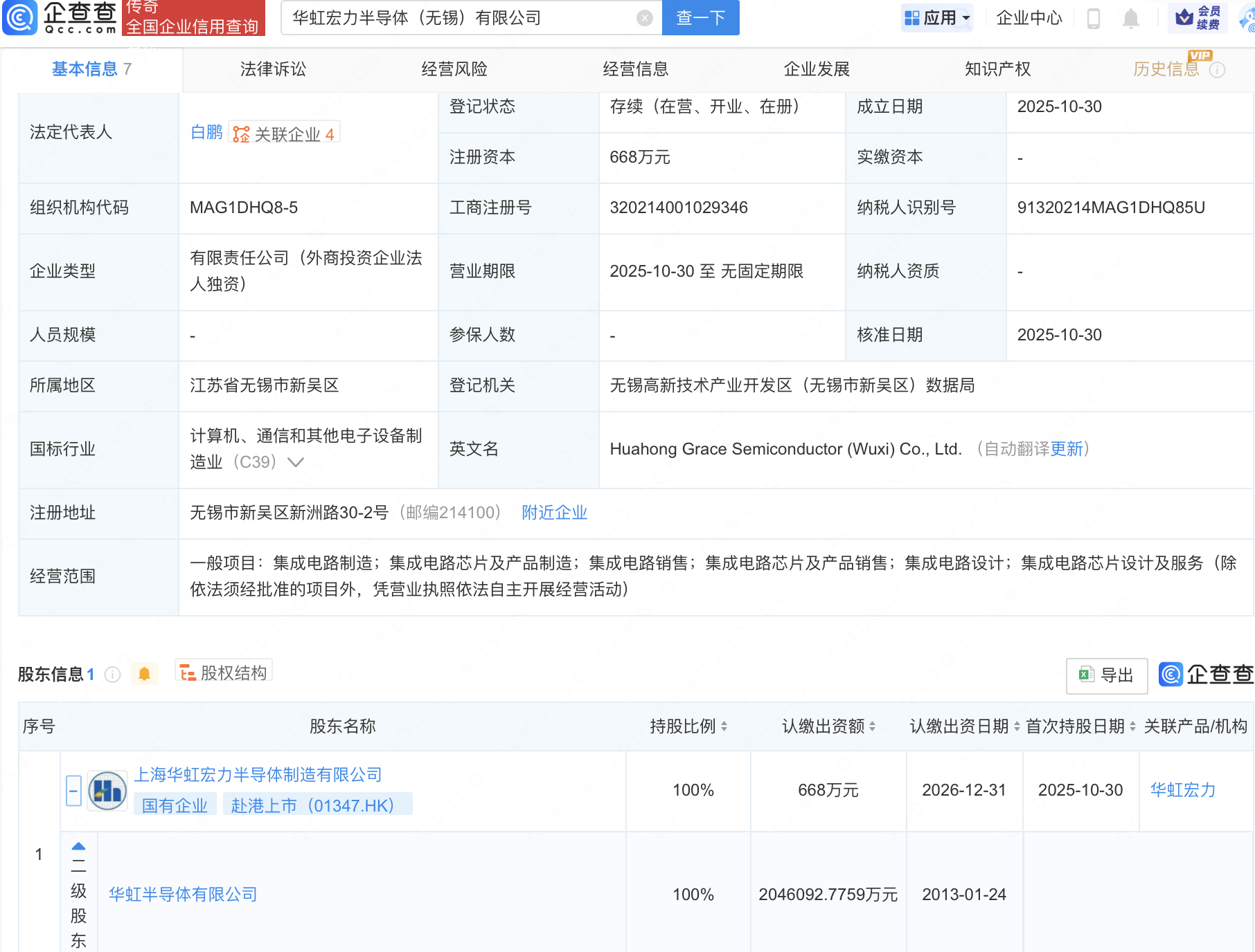 企查查APP显示,近日,华虹宏力半导体(无锡)有限公司成立,经营范围包含:集成电路制造;集成电路芯片及产品制造;集成电路销售;集成电路芯片及产品销售;集成电路设计;集成电路芯片设计及服务。企查查股权穿透显示,该公司由华虹半导体(01347.HK)旗下上海华虹宏力半导体制造有限公司全资持股。