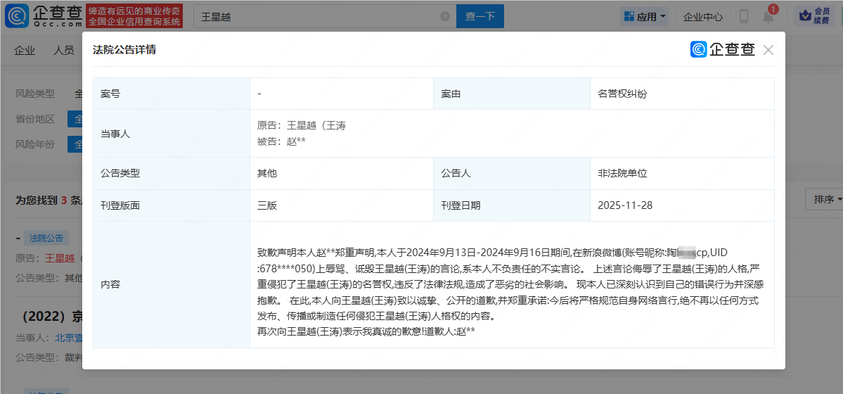 企查查APP显示,11月28日,赵某某登报向王星越(王涛)公开道歉。赵某某承认,其于2024年9月13日-2024年9月16日期间,在涉案账号上辱骂、诋毁王星越的言论,系不负责任的不实言论。