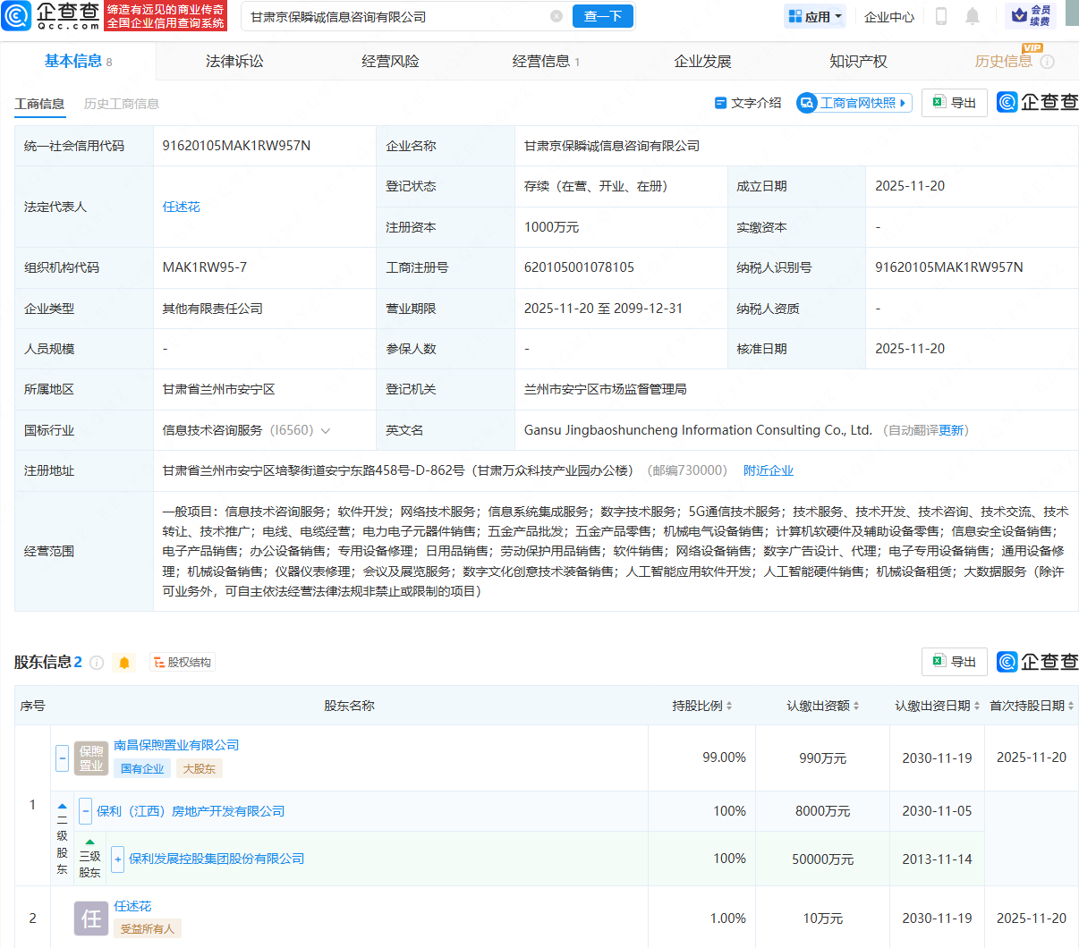 企查查APP显示,近日,甘肃京保瞬诚信息咨询有限公司成立,法定代表人为任述花,注册资本为1000万元,经营范围包含:数字技术服务;5G通信技术服务;电线、电缆经营;电力电子元器件销售;人工智能应用软件开发等。企查查股权穿透显示,该公司由保利发展(600048)旗下南昌保煦置业有限公司、任述花共同持股。