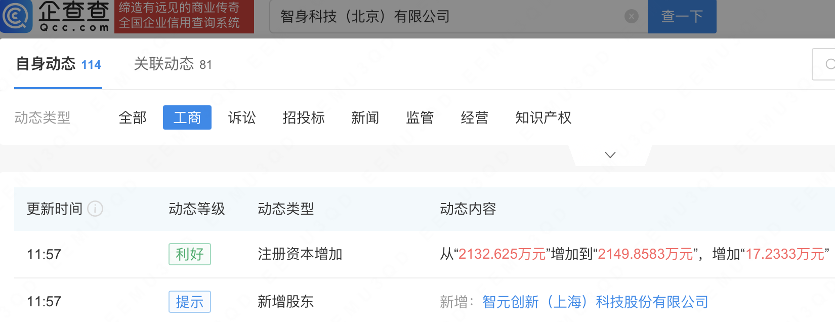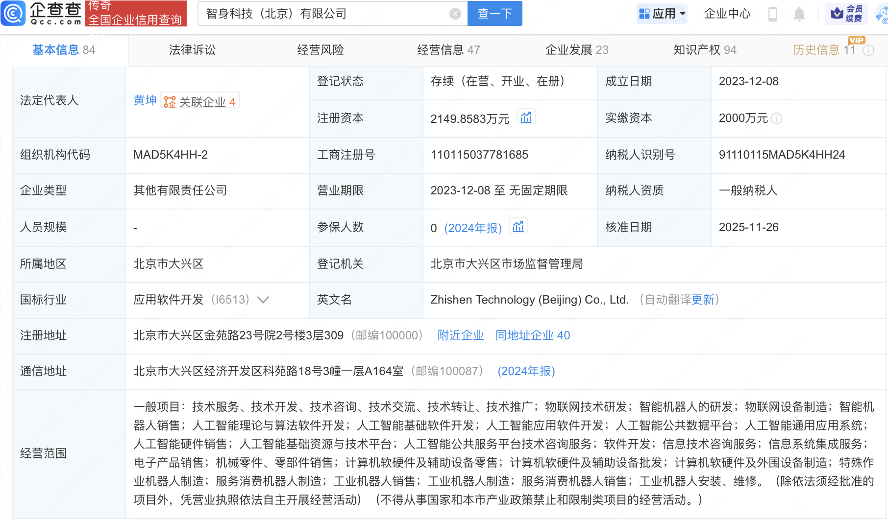 企查查APP显示,近日,智身科技(北京)有限公司发生工商变更,新增智元机器人关联公司智元创新(上海)科技股份有限公司为股东,同时注册资本增至2149.86万元。企查查信息显示,该公司成立于2023年,法定代表人为黄坤,经营范围包含:智能机器人的研发;人工智能基础软件开发;人工智能应用软件开发;人工智能公共数据平台等。公开信息显示,智身科技是一家专注于具身智能领域的科技公司。