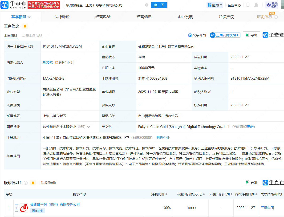企查查APP显示,近日,福麒麟链金(上海)数字科技有限公司成立,法定代表人为郭凌欢,注册资本为1亿元,经营范围包含:区块链技术相关软件和服务;工业互联网数据服务;数据处理和存储支持服务;物联网技术服务等。企查查股权穿透显示,该公司由福建省三钢(集团)有限责任公司全资持股。